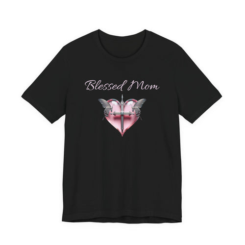 Blessed Mom Graphic Design T-Shirt - Pink Heart and Silver Gothic Cross with Butterflies